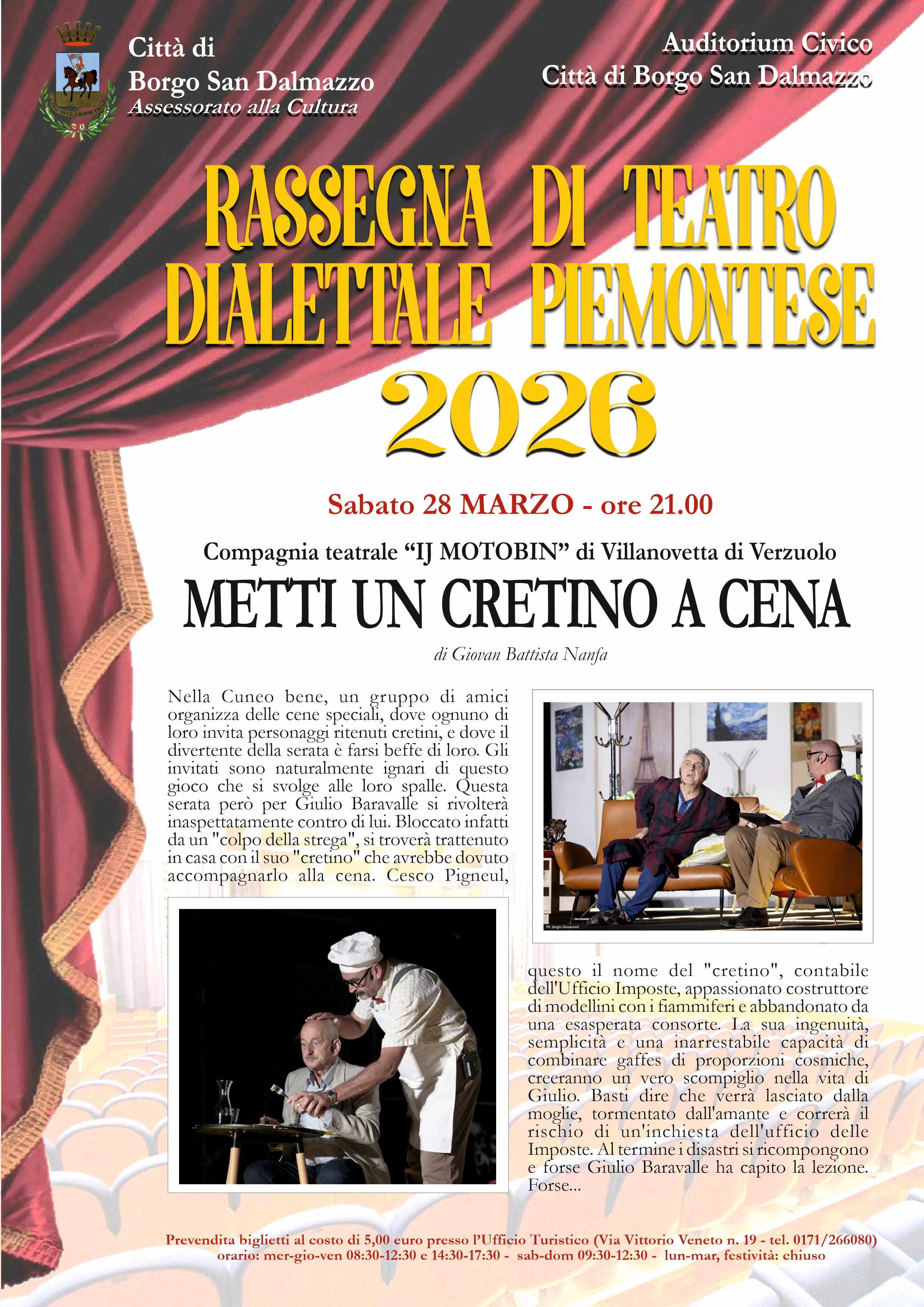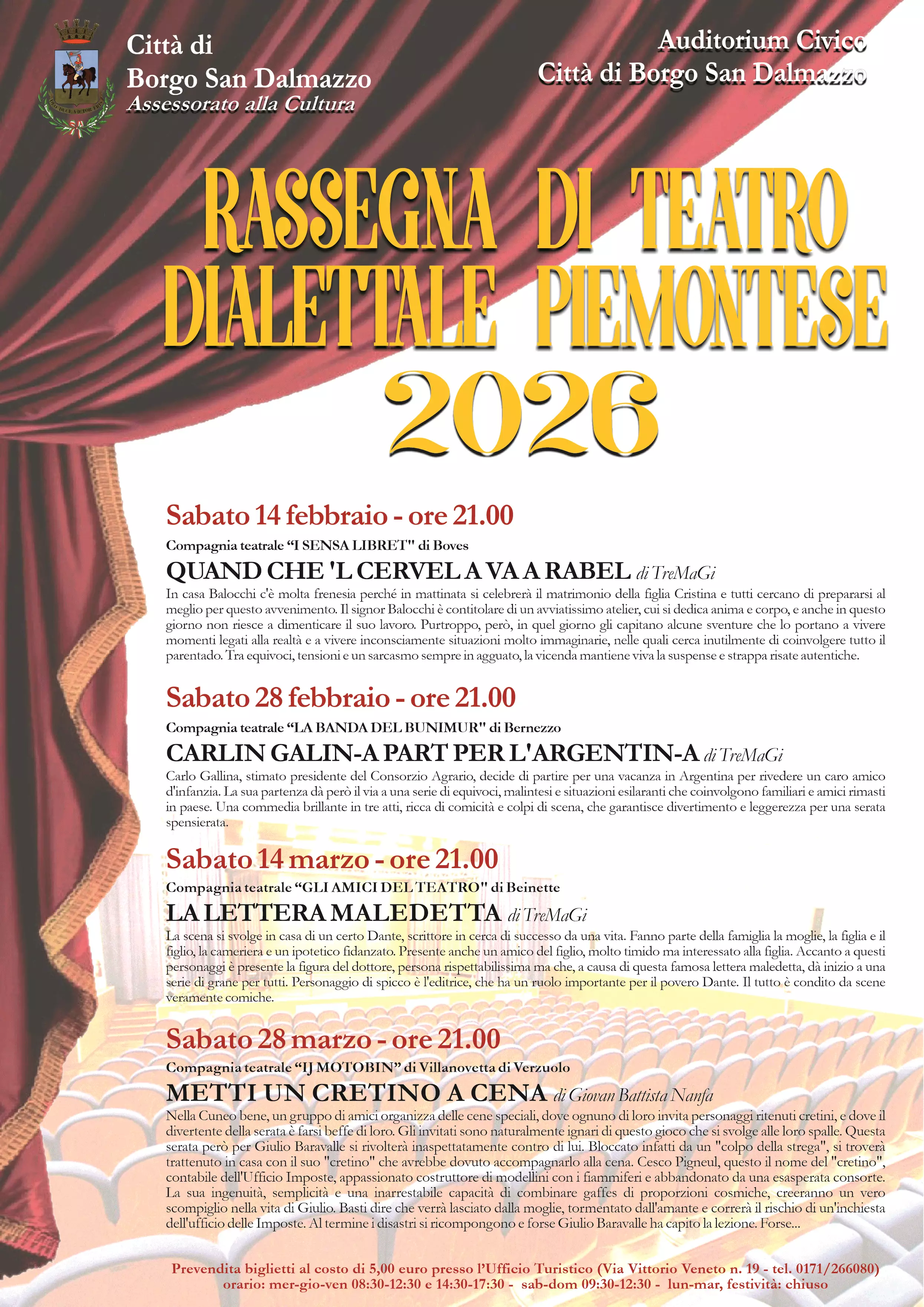 L’Assessorato alla Cultura della Città di Borgo San Dalmazzo presenta l’edizione 2026 della Rassegna di Teatro Dialettale Piemontese, in programma all’Auditorium Civico. Quattro serate, tutte con inizio alle ore 21.00, dedicate al teatro dialettale piemontese e alle compagnie del territorio. Una rassegna che propone commedie brillanti, ricche di situazioni paradossali, personaggi spassosi e atmosfere tipiche della nostra tradizione popolare.