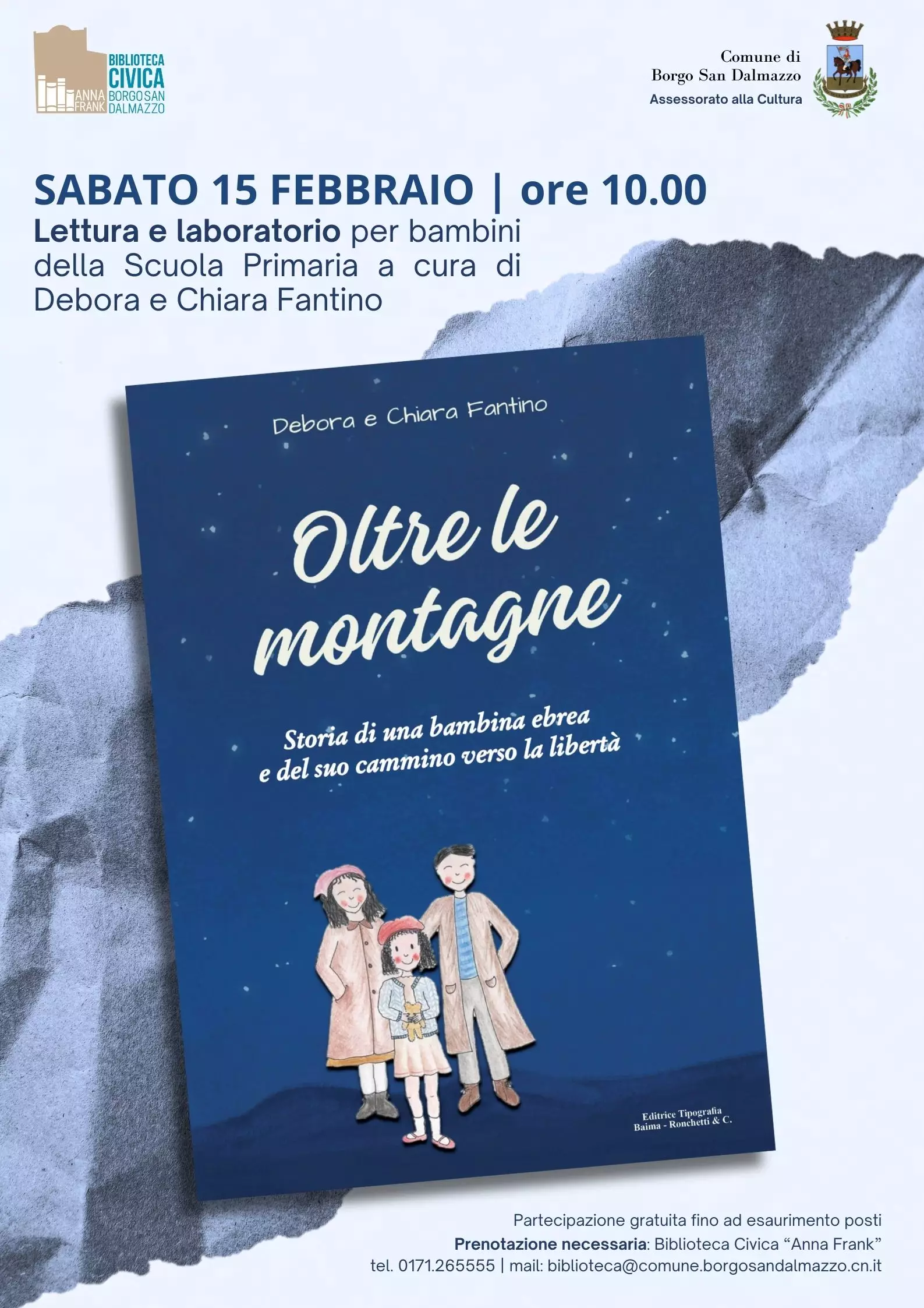 L’attività è gratuita, necessaria la prenotazione presso la Biblioteca Civica "Anna Frank" di Borgo San Dalmazzo (Info: biblioteca@comune.borgosandalmazzo.cn.it - Tel. 0171 265 555).