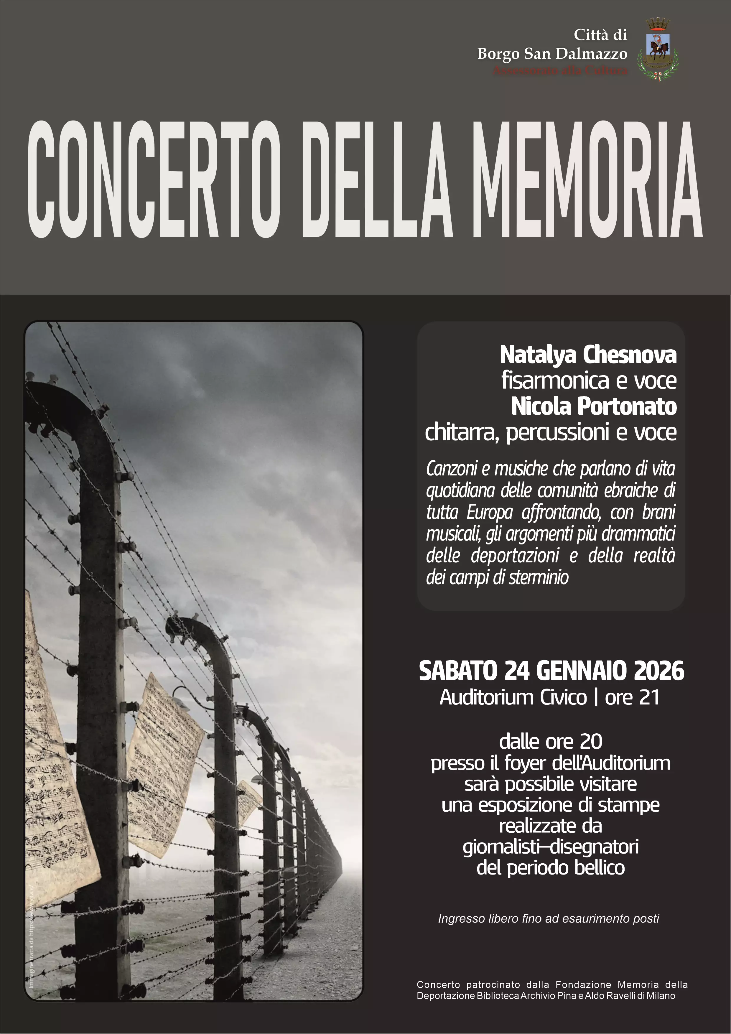 Sabato 24 gennaio, all’Auditorium Civico, dalle ore 20.00 sarà possibile visitare l’esposizione delle stampe realizzate da giornalisti e disegnatori del periodo bellico. Alle ore 21.00 seguirà il Concerto della Memoria con Natalya Chesnova (fisarmonica e voce) e Nicola Portonato (chitarra, percussioni e voce): un percorso musicale dedicato alla vita quotidiana delle comunità ebraiche europee e ai temi più drammatici delle deportazioni. L’ingresso è gratuito fino a esaurimento posti.