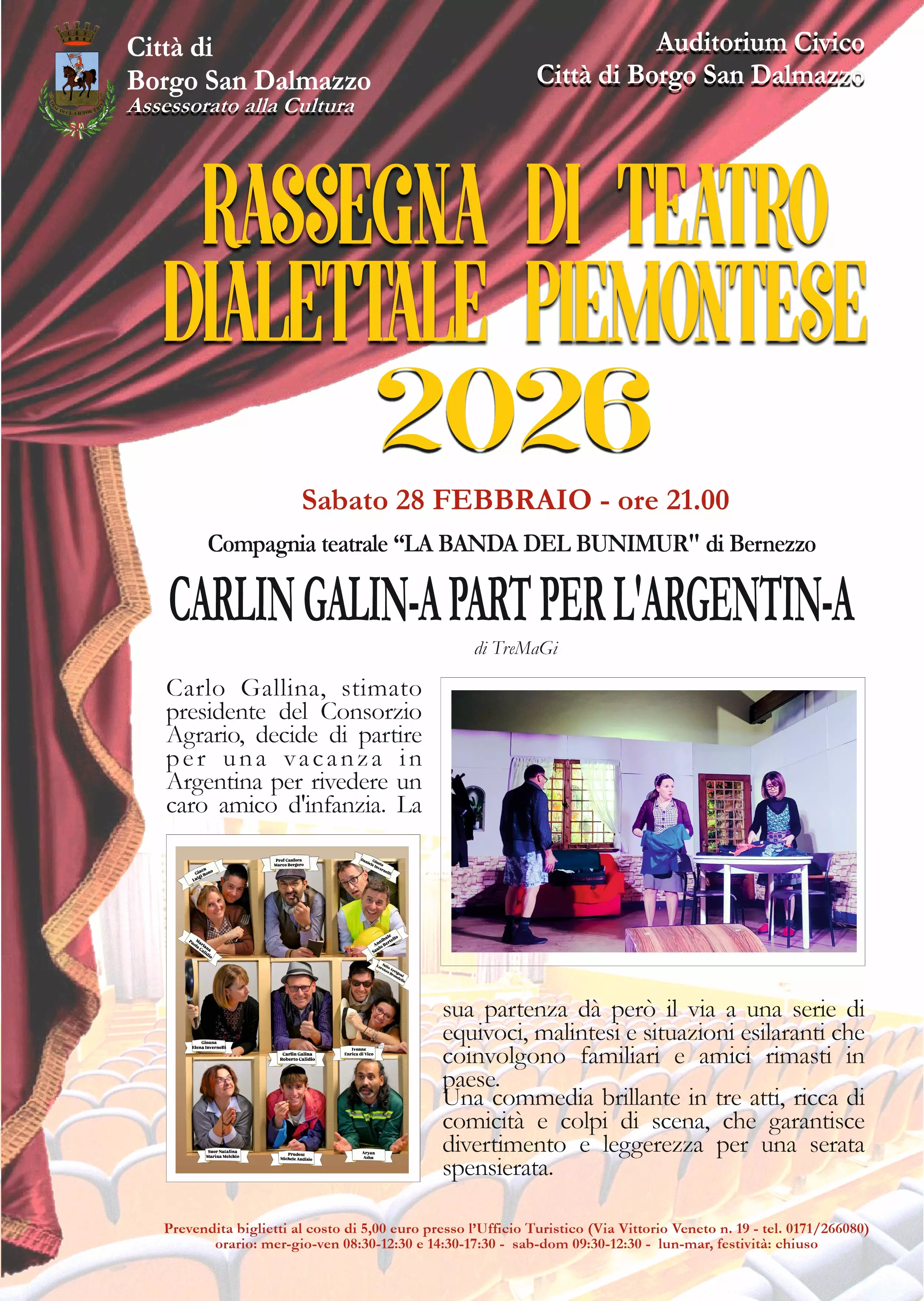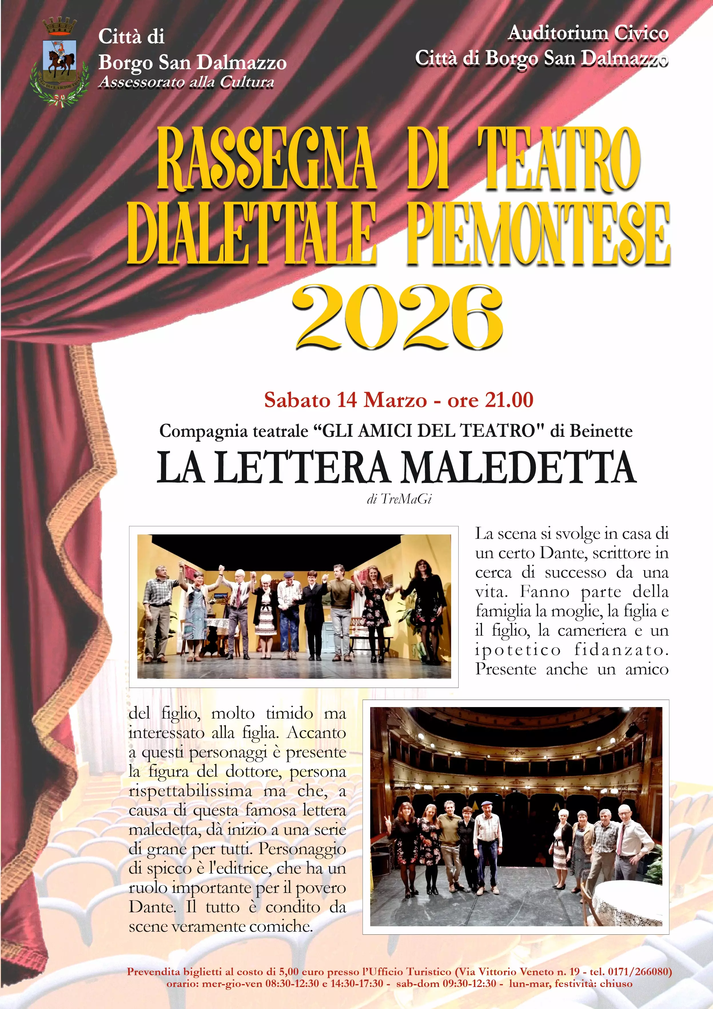 L’Assessorato alla Cultura della Città di Borgo San Dalmazzo presenta l’edizione 2026 della Rassegna di Teatro Dialettale Piemontese, in programma all’Auditorium Civico. Quattro serate, tutte con inizio alle ore 21.00, dedicate al teatro dialettale piemontese e alle compagnie del territorio. Una rassegna che propone commedie brillanti, ricche di situazioni paradossali, personaggi spassosi e atmosfere tipiche della nostra tradizione popolare.