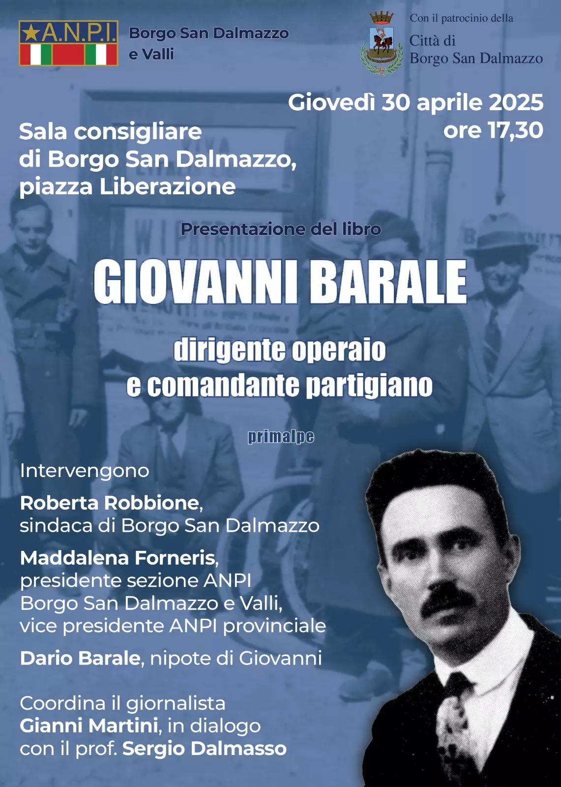 Sono inoltre previste iniziative di approfondimento storico: giovedì 30 aprile, alle ore 17.30 nel Salone Consiliare, si presenterà la ristampa del volume Giovanni Barale dirigente operaio e comandante partigiano, realizzata da Edizioni Primalpe. L’incontro, promosso da ANPI Borgo San Dalmazzo e Valli con il patrocinio della Città di Borgo San Dalmazzo, vedrà l’intervento della sindaca Roberta Robbione, della presidente ANPI Maddalena Forneris e di Dario Barale, nipote di Giovanni. Il giornalista Gianni Martini coordinerà il dialogo insieme al prof. Sergio Dalmasso.